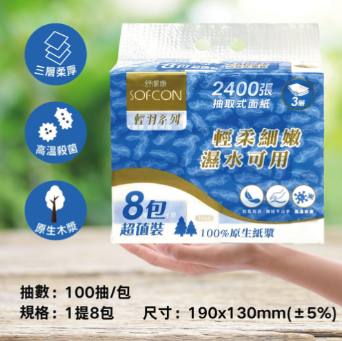 抽數:100抽 × 8包 尺寸:130 × 190 mm(±5%) 成分:100%原生紙漿 保存期限:5年